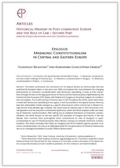 Uladzislau Belavusau and Aleksandra Gliszczyńska–Grabias, Epilogue: Mnemonic Constitutionalism in Central and Eastern Europe, European Papers, 5(3), 2020, pp.1231-1246.